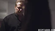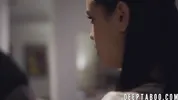 Pale babysitter sucks on mature father's hard cock and chokes on it before bending over and taking him inside her pussy.