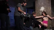 Juliette March - On movie bdsm set sexy hairy pussy brunette slut Juliette March is taken by interracial film crew and anal gangbang fucked by their big dicks
