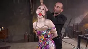 Delirious Hunter - Tied up pale hot brown haired hottie Delirious Hunter gagged in standing bondage in flower printed dress gets whipped then in doggy banged by big dick