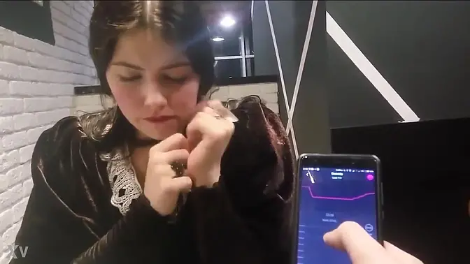 In a public restaurant setting, her boyfriend teases her with an Ohmibod, bringing her to the edge of an orgasm. The remote control adds to the excitement as she squirms in her seat. He finally gives her the release she's been craving, leaving her satisfied and red-faced.