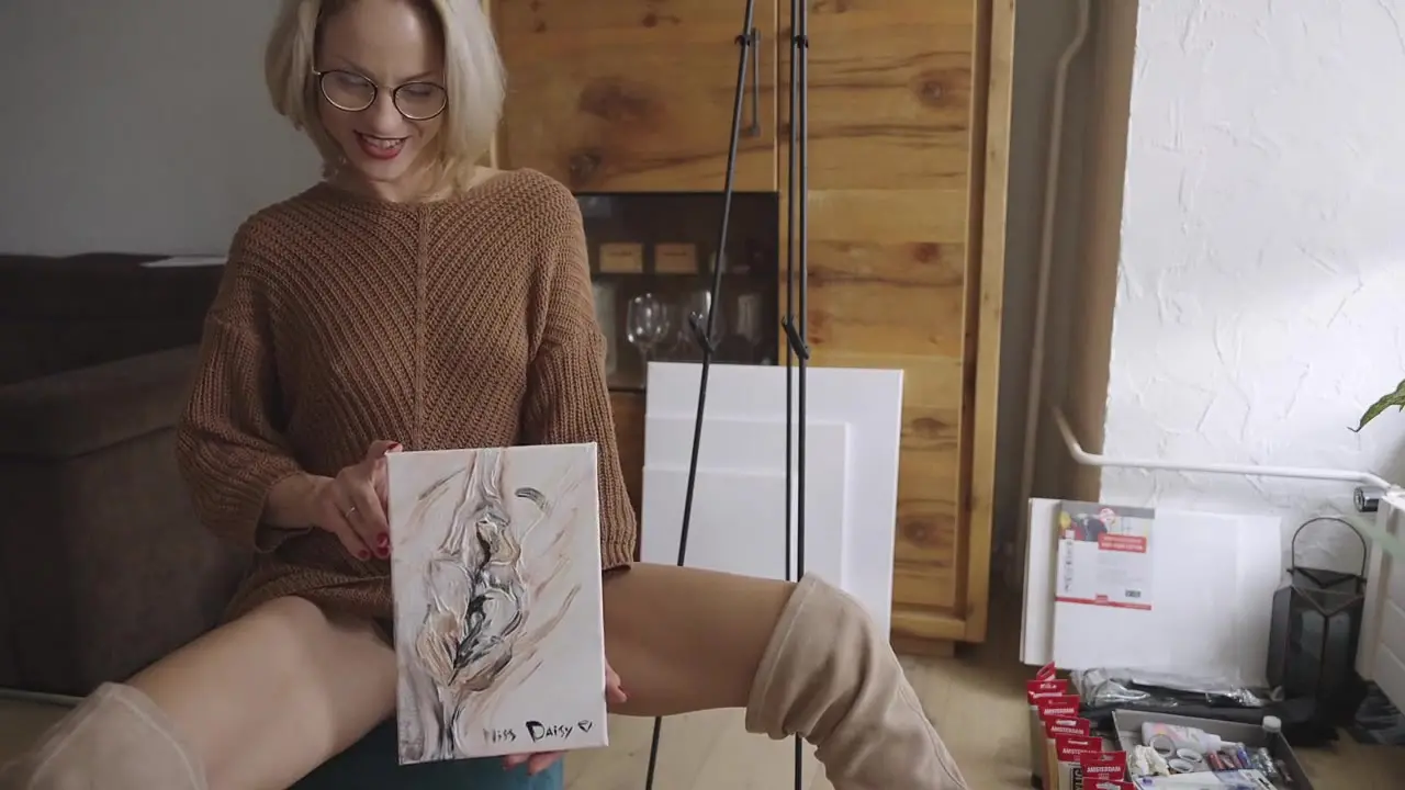 Sexy blonde beauty with glasses poses seductively in her thigh high boots. She strokes her beautiful face and showcases her natural tits, teasing the camera. This gorgeous white girl is the epitome of beauty.